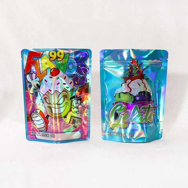 Custom Resealable Holographic Mylar Bags Food Smell Proof Candy Pouch Packing 3.5g 7g 14g Child Resistant Lock Foil Pouch